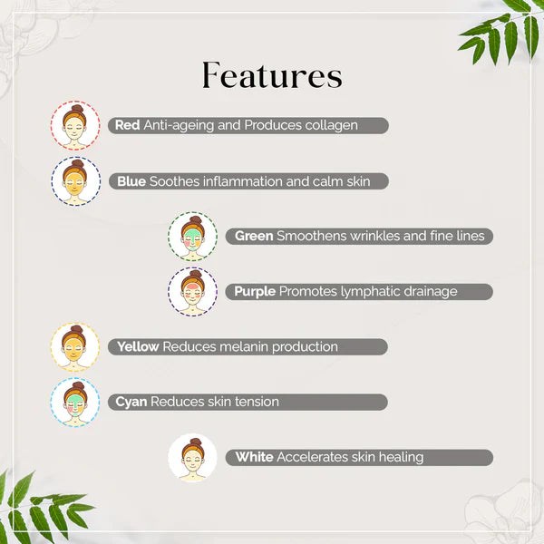 🌈 Each LED color targets specific skin concerns like acne (blue), wrinkles (red), uneven tone (green), and more.
